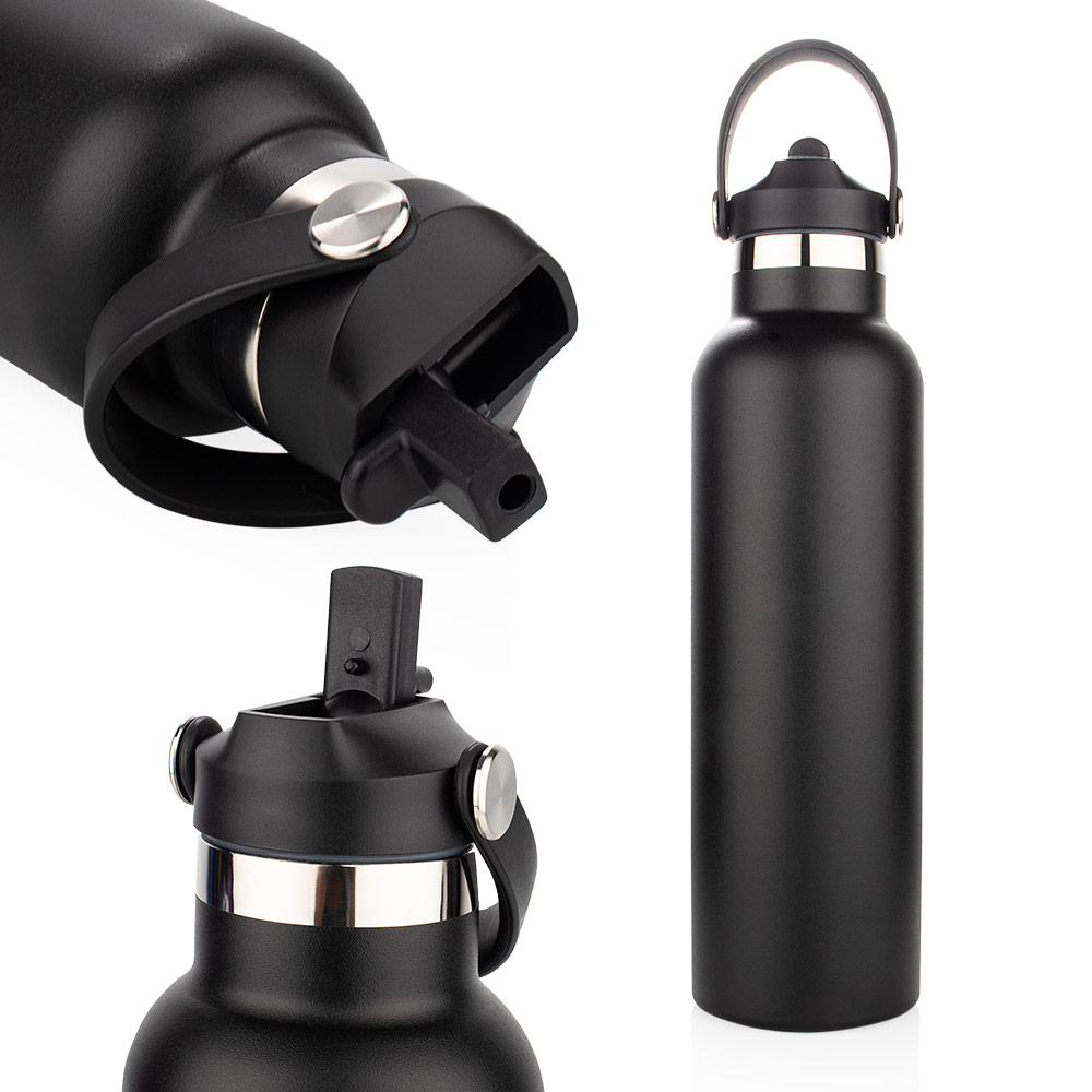 Hidratación que acompaña tu ritmo.Botella deportiva con doble pared, sellada al vacío. Interior de acero 304 y exterior de acero 201. Pintura powder coat (pintura más duradera y resistente a la corrosión y el paso del tiempo). Tapa plástica a rosca con anillo de silicona combinada con tapa contraible a presión y traba de seguridad antiderrame. Asa flexible y resistente de TPE. Boquilla con bombilla incluida. Base con grip de silicona del mismo color de la tapa. Mantiene hasta 12 hs la temperatura de las bebidas calientes y hasta 24 hs de las bebidas frías. Medidas: Ø 7,5 cm x 26,5 cm. y ancho de tapa 11 cm. Capacidad: 840 ml. Materiales: Acero inoxidable, elastómero termoplástico, silicona y plástico ABS, polipropileno y poliestireno. Presentación: en caja de regalo color negro mate.