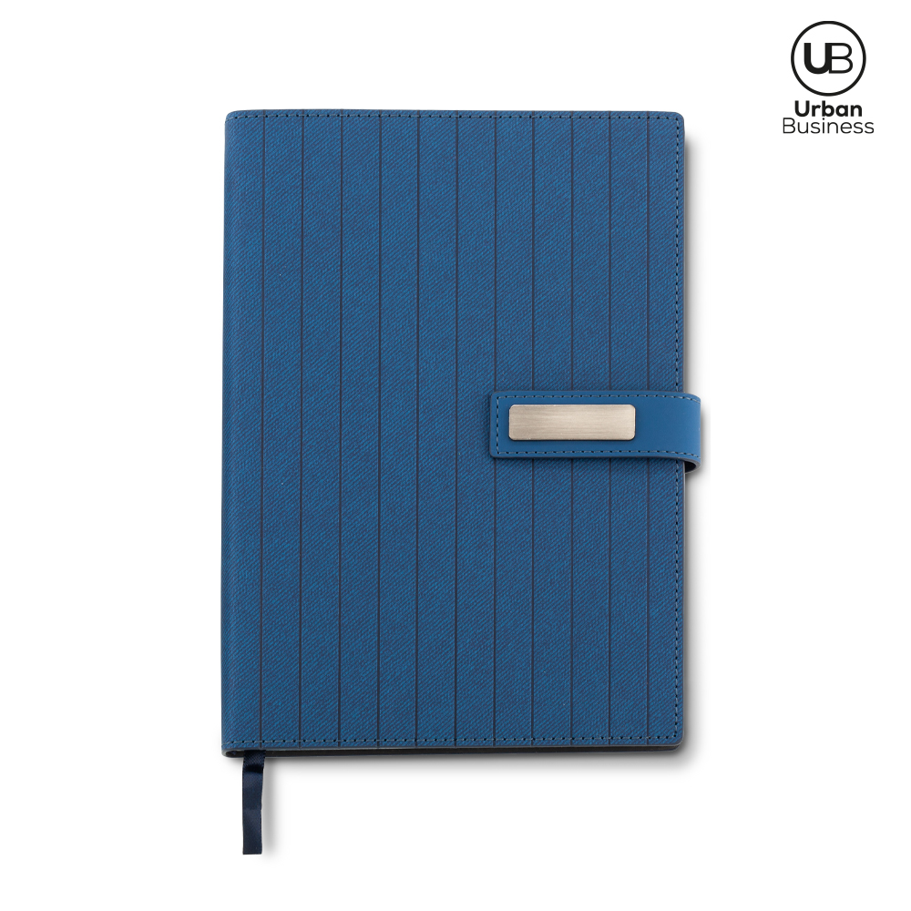 Libreta en poliuretano con cierre imán. 96 hojas rayadas. Incluye placa para marca. Empaque caja individual.