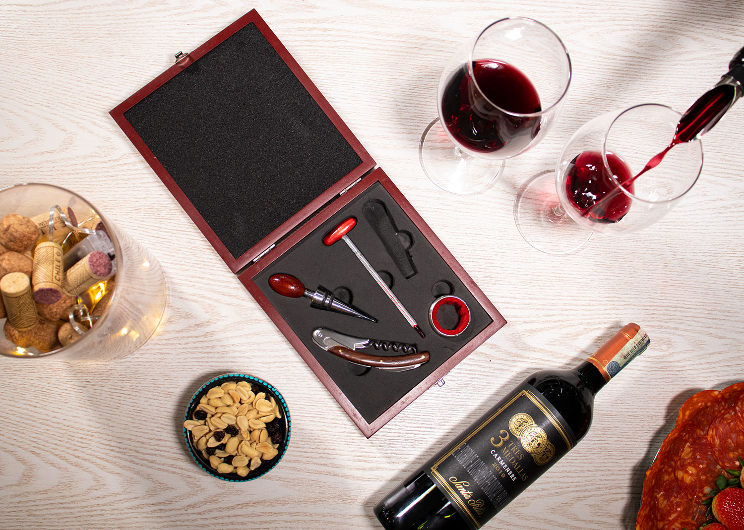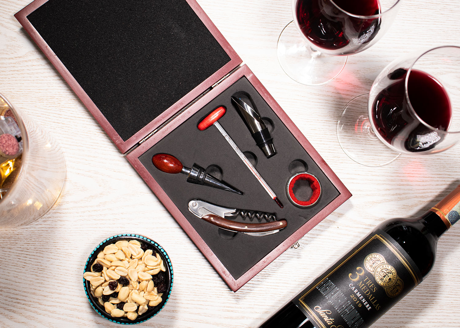 Contiene 5 accesorios con apliques en madera: Sacacorchos de un tiempo, tapon metalico, termometro, aro antigoteo, cortagotas. Caja vinotinto con interior negro.