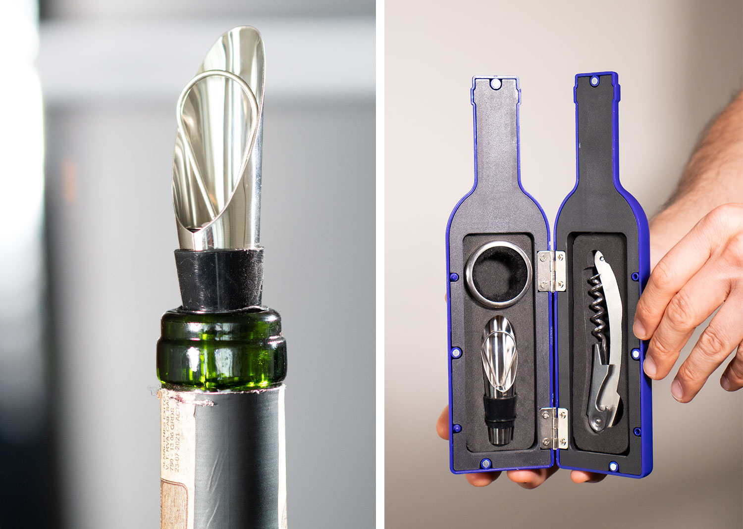 Contiene 3 accesorios de bar: Tapon para botella, aro anti goteo, sacacorchos de 1 tiempo. Caja con diseño de botella y acabado en goma.