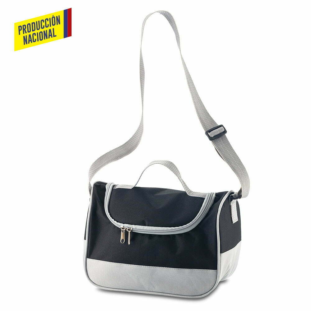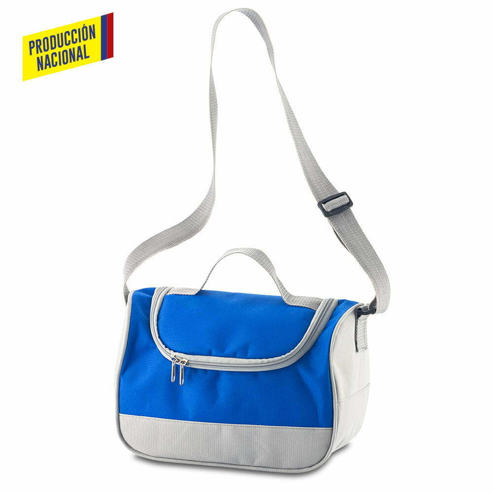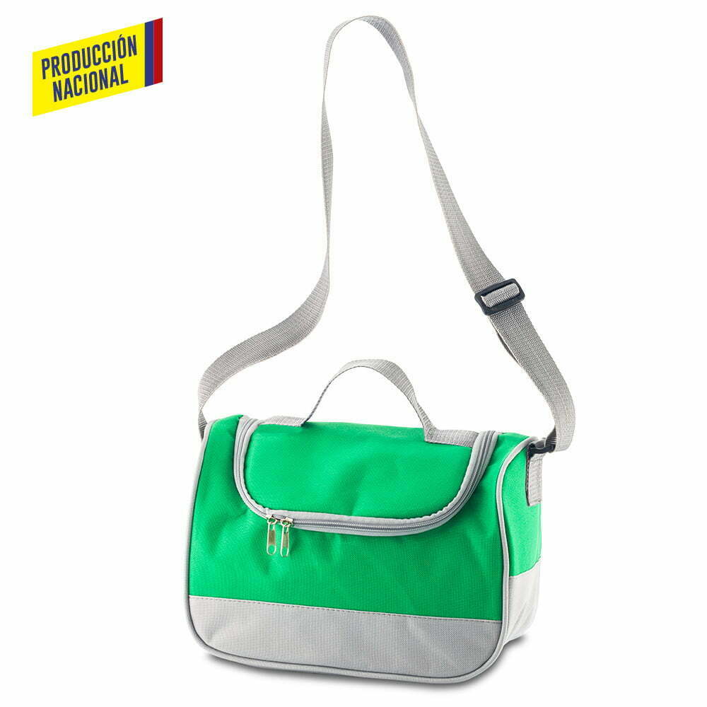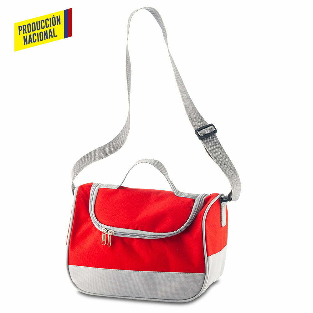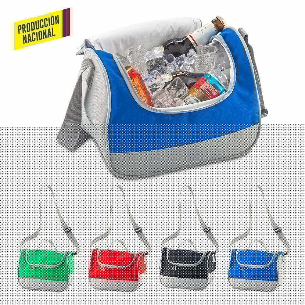 Lonchera nevera en lona poliéster, interior en lindasoft. Cierre de cremallera, reata ajustable y manija en reata para cargar.