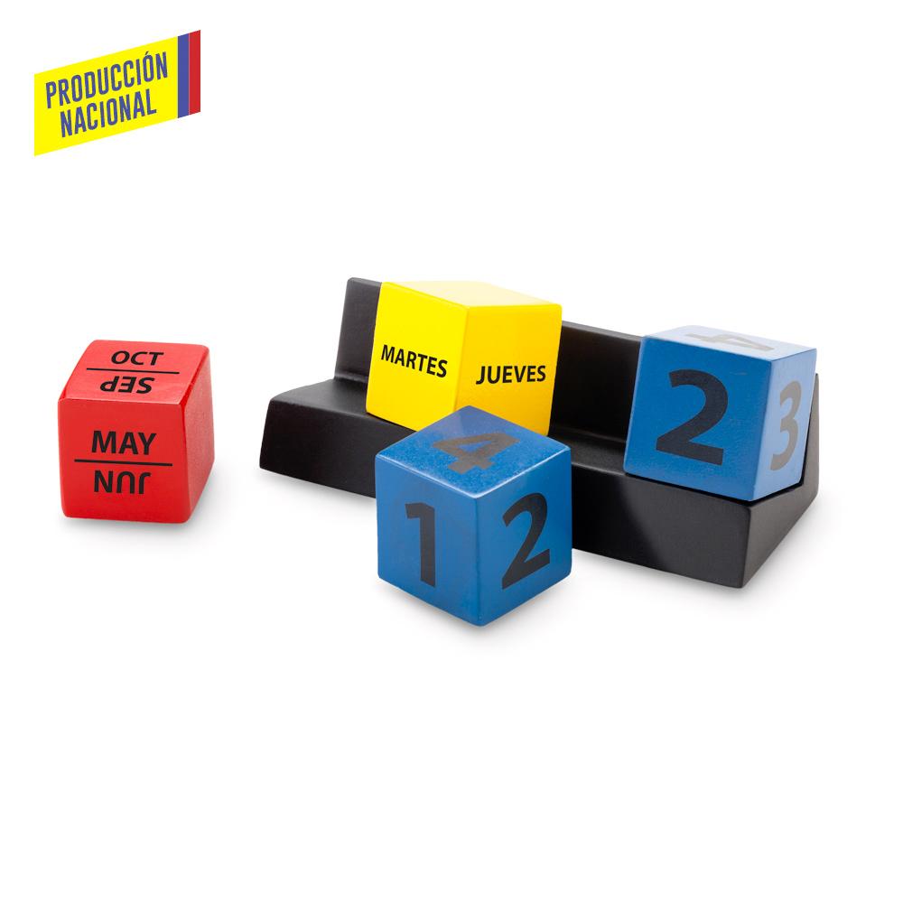 Base elaborada en MDF, con pintura catalizada, incluye 4 cubos (1 amarillo, 1 rojo y 2 azules) con dias de la semana, meses y con numero del dia. Empaque caja Individual. Nota importante: Este es un producto elaborado a mano, si no hay disponibilidad en stock la entrega de su pedido será de 40 días calendario aproximadamente después de enviada la orden de compra.